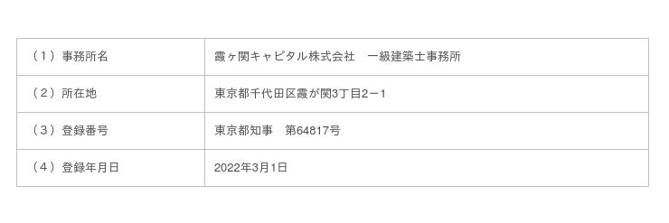 霞ヶ関キャピタル株式会社(本社:東京都千代田区、代表取締役:河本幸士郎、以下「当社」)は、この度、一級建築士事務所の登録を完了いたしましたことをお知らせいたします。