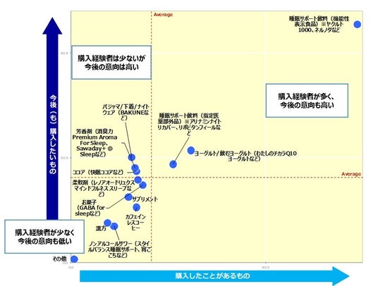 購入経験と購入意向の関係性を確認したところ、「睡眠サポート飲料(機能性表示食品)」は購入経験者も今後の購入意向も高くなっています。一過性のブームではなく習慣化していきそうです。「パジャマ/下着/ナイトウェア」「芳香剤」「ココア」はまだ購入経験者は少ないけれど購入意向は高く、今後伸びていくポテンシャルがあると考えられます。左下のブロックに位置する「柔軟剤」「お菓子」「サプリメント」などの商品はまだ市場に浸透しておらず、興味度も薄くなっています。