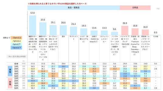続いて睡眠の質向上を訴求する商品で効果が得られると思うものを確認しました。最も高いのは「睡眠サポート飲料(機能性表示食品)」で57.0%。指定医薬部外品、漢方、サプリメントよりも効果が得られそうと感じられています。日用品では「パジャマ/下着/ナイトウェア」が最も高く、特に女性の選択率が高い傾向にあります。