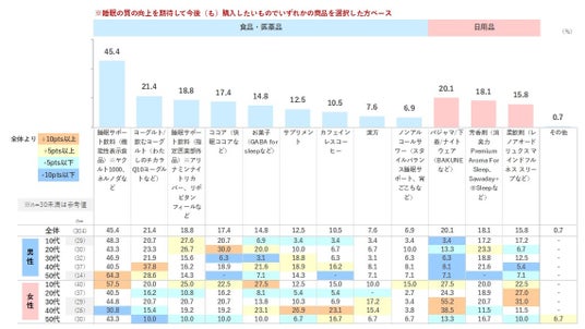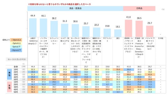 反対に効果が得られないと思うものを確認したところ、「お菓子」が44.4%「ノンアルコールサワー」が44.1%となり、元々の製品が持つ特徴が健康促進のイメージと少し乖離がある様子が見られます。日用品では「柔軟剤」「芳香剤」といった香りものの選択率が高く、パジャマ/下着/ナイトウェアに比べると期待感は薄くなっています。
