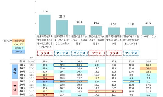 普段の睡眠スタイルは「起床時間を変えずに睡眠リズムを一定に保つようにしている」が最多の36.4%で、50代では約半数が選択。10代は「起床時間は日によってバラバラなことが多い」の選択率がほかの年代より高い。