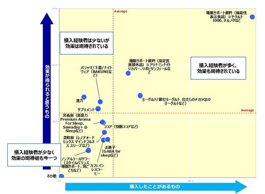 購入経験があるものと効果が得られると思うものの関係性を確認しました。「パジャマ/下着/ナイトウェア」はまだ市場に浸透していないけれど効果の期待感は高く、今後のビジネスチャンスが期待できるポジションにあります。一方「ノンアルコールサワー」「カフェインレスコーヒー」「お菓子」「柔軟剤」といった商品はまだ市場に浸透していない現状で期待感も今一つとなっています。睡眠の質向上を訴求する商品が増えてきている今、どのような仕組みで改善できるのかのエビデンスを明確に伝えていかないと生活者に理解されないまま埋もれてしまう危険があります。