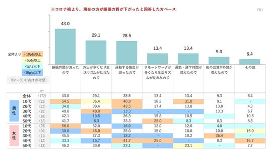 睡眠の質が低下した理由は「睡眠時間が減った」が4割強、次に「外出が多くなり生活リズムが乱れた」が続く。コロナ禍が明けて行動制限がなくなりアクティブな生活が戻った今、睡眠悩みに影響が出てきている。