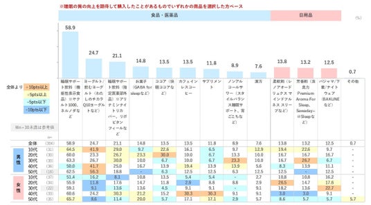 睡眠の質向上を訴求する商品では「睡眠サポート飲料(機能性表示食品)」が購入経験者が多く、今後の購入意向と効果期待値も高い。ヤクルト1000の希少性がなくなってきた今、一過性のブームではなく浸透してきていることがうかがえる。今はまだ購入経験者は少ないが、今後の購入意向と期待値が高いものに「パジャマ/下着/ナイトウェア」が挙げられる。