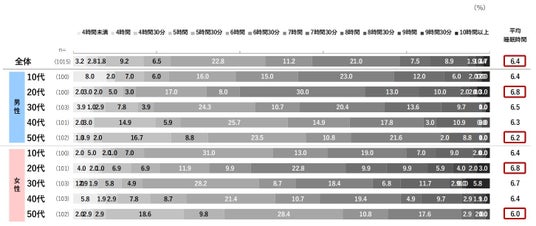 平均睡眠時間を確認したところ、全体の平均は「6.4時間」でした。いずれの年代もボリュームゾーンは5時間30分~7時間30分です。年代別で見ると、最も睡眠時間が多いのは20代で、男女ともに「6.8時間」、最も睡眠時間が短いのは50代で、男性が「6.2時間」女性が「6.0時間」となっています。