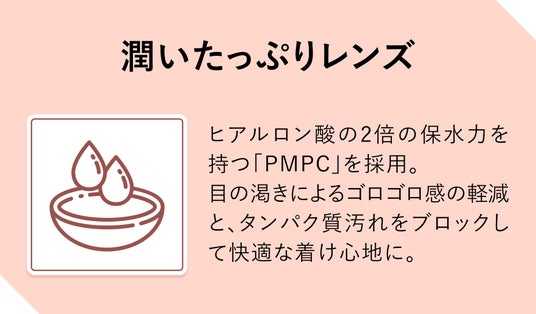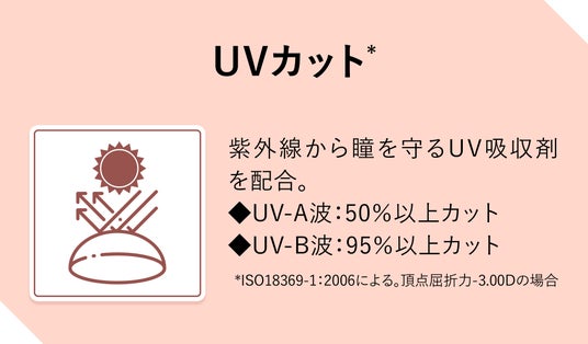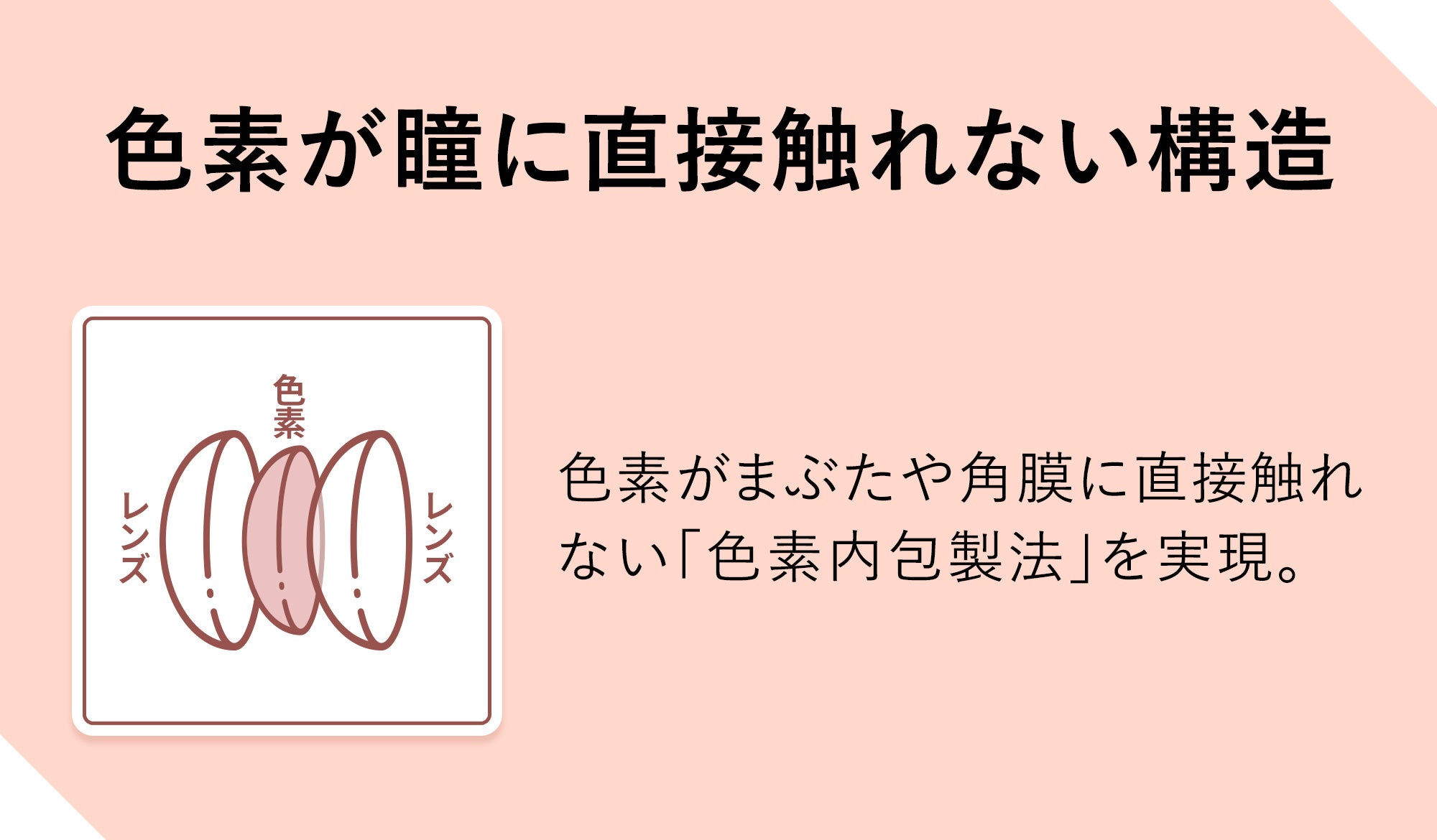 毎日使用するものだからこそ、装用時の快適さや清潔さに配慮しています。潤いを保ちやすく、色素が直接瞳に触れない構造にし、酸素透過性への配慮やUVカット*機能など、複数の装用シーンを想定したレンズ設計となっています。