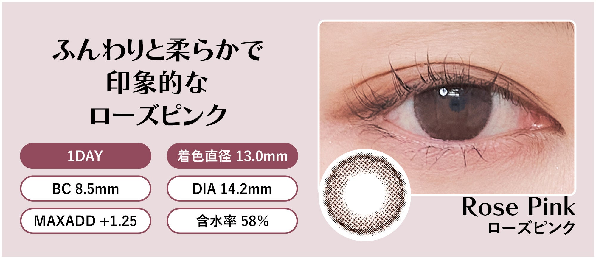 遠近両用レンズでありながら、生活のさまざまなシーンになじむカラー設計を採用。モカブラウン、エレガントブラック、ハニーヘーゼル、ローズピンクの4色を展開し、いずれも過度な発色を抑え、瞳本来の印象を活かすことを目指しました。当社が140名のカラコンユーザーを対象に実施したアンケート調査では、40代以上の女性の約75%が「バレにくいナチュラル感」や「ほどよく印象が変わるデザイン」を好む傾向が見られており、こうした結果を踏まえて日常使いしやすいカラー設計にいたしました。仕事やプライベートなど、幅広いシーンで使いやすいデザインを追求しています。