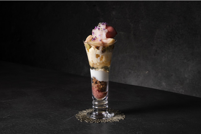 果肉と果汁の繊細な甘さと香りを楽しめる桃と、酸味の効いた濃厚味の自家製完熟プラムのソルベ、ピスタチオのジョコンド、クランブル、バニラジェラート、桃のコンポート、カモミールジュレ、フロマージュブランのムースをあわせた逸品。トッピングに桃のグラニテと花穂じそも飾りました。一口食べるごとにフルーツの多様な味、食感を楽しめる、至福のときをもたらす期間限定パフェです。