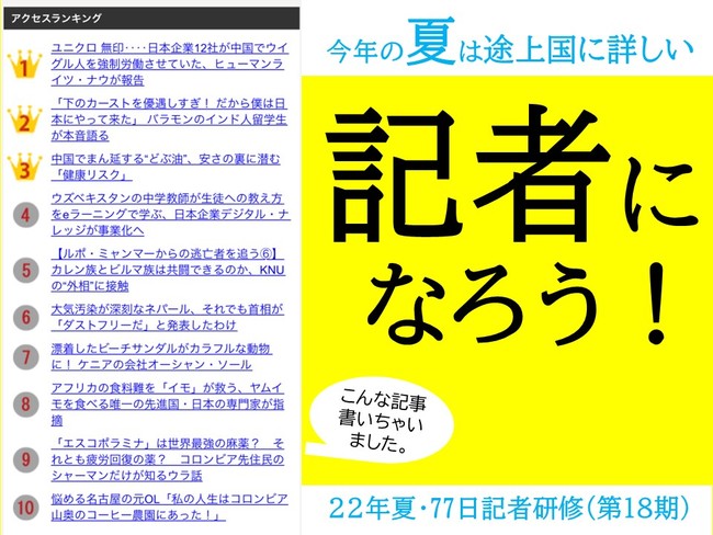 ですが、これらは言うは易し行うは難し。途上国の知識も、取材をして記事を書くスキルも必要なわけですから。