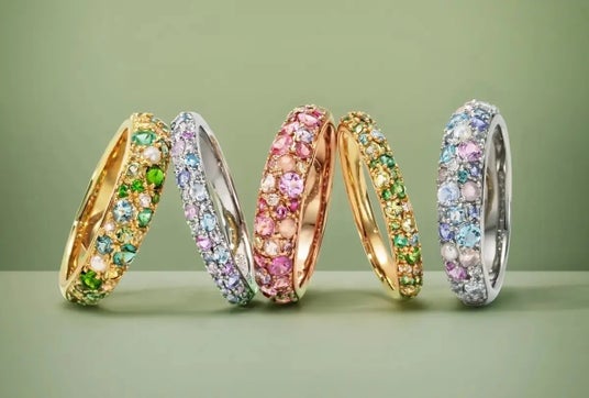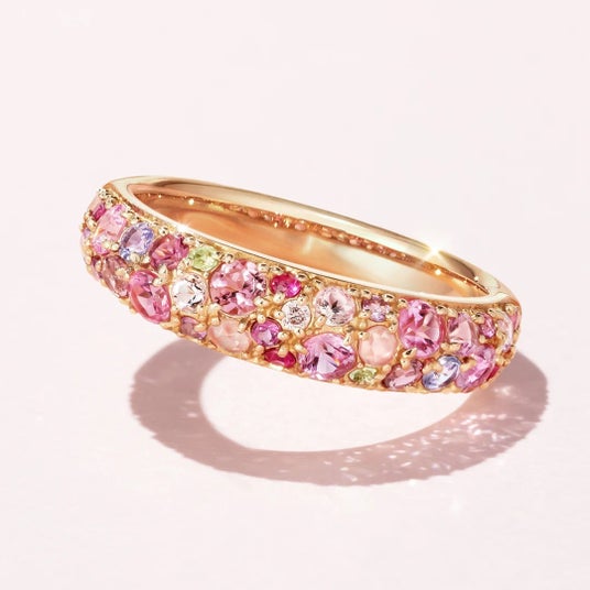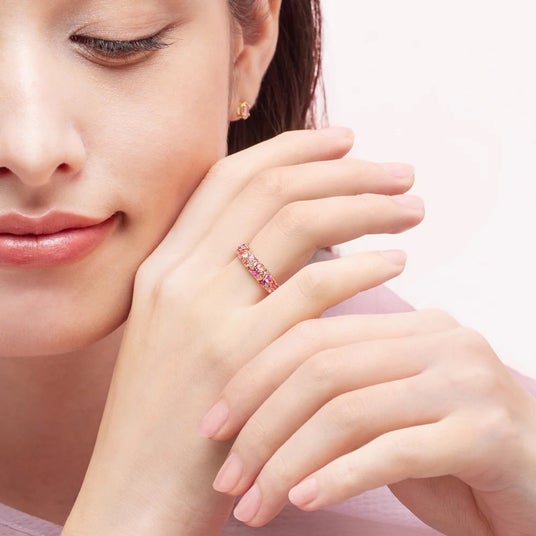 カラーエタニティシリーズ「エマ」より、世界三大希少石のひとつでもある「パパラチアサファイア」が登場します。ピンクとオレンジが溶け合う繊細なニュアンスカラーの宝石を厳選し、宝石が指を覆うような圧巻の華やぎを叶えました。