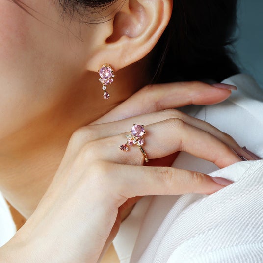 簪(かんざし)をモチーフに、時を超えて愛され続ける日本古来の美意識を、桜のカラーリングで再現した「サクラベルエゼン」。クンツァイト、サファイア、ガーネットなど、希少な薄紅色の宝石を集めて、春風になびくしだれ桜のしなやかな佇まいを、モダンなジュエリーへと再解釈しました。