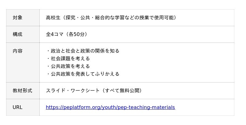 公益財団法人国際文化会館 政策起業家プラットフォーム(東京都港区、理事長 近藤 正晃ジェームス、以下、PEP(ペップ): Policy Entrepreneur’s Platform)は、一般社団法人 Fora(東京都中央区、代表理事 藤村琢己) の協力のもと、高校の「探究」などの授業で活用できる教材「政策起業アントレプレナーシップ教育 高校探究のための学習支援教材パッケージ」(以下、本教材)を開発し、Web 上で無料公開しました。本教材は、政策立案を通じて社会課題を解決する「政策起業」の手法を学習し、生徒がアントレプレナーシップを身につけることを目指しています。社会や公共の授業で学ぶ知識とアントレプレナーシップ教育をつなぎ、より多くの教育現場で実践的な学びを促すことが目的です。