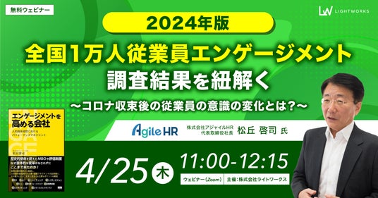 企業向け学習管理システム(LMS)「CAREERSHIP」やeラーニング受け放題サービス「まなびプレミアム」などを提供する株式会社ライトワークス(本社:東京都千代田区、代表取締役:江口夏郎)は、2024年4月25日(木)に、全国1万人を対象に行った「A&Iエンゲージメントサーベイ標準調査」の調査結果(2024年最新版)をもとに、日本のエンゲージメントの実態を解説する無料ウェビナーを開催いたします。