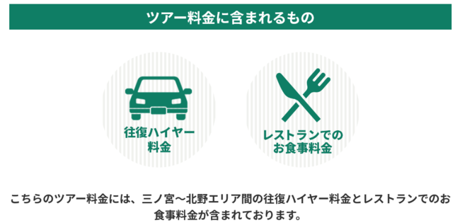 こちらのツアー料金には、三ノ宮~北野坂エリア間の往復ハイヤー料金とレストランでのお食事料金が含まれております。