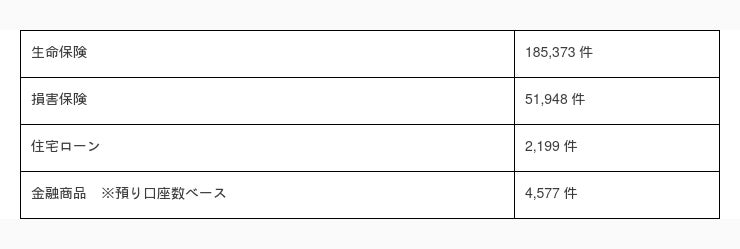 当社コンサルタント(FP・IFA)は主に新卒で構成されていますが「教育部」という教育専門機関を設けて育成を行っており、MDRTの入会率は70.4%、IFA(証券外務員取得者)は3人に1人の割合です。実際のご提供実績としても、2023年3末時点で商品別のご契約数は以下の通りとなっております。