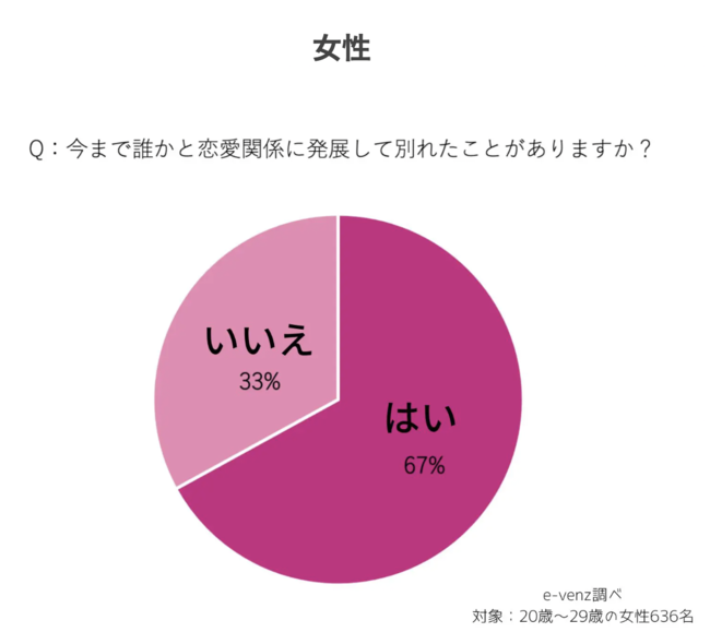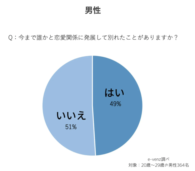 男性の約半数、女性の約7割がこれまで恋愛をして別れた経験がある回答しました。