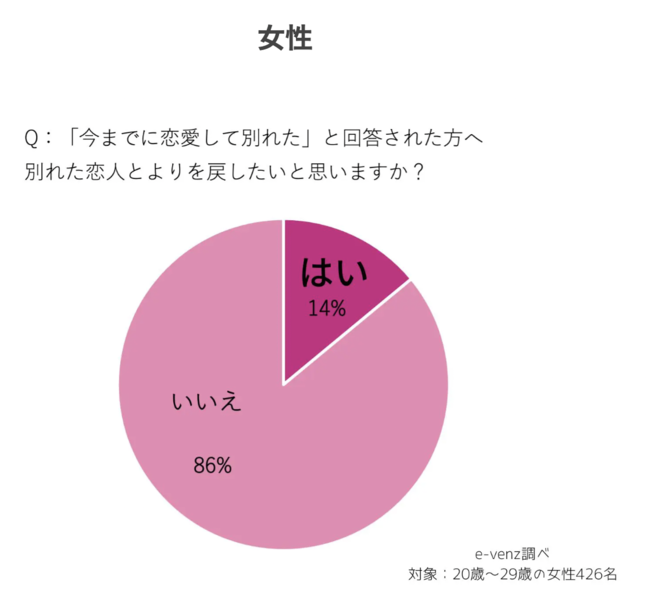 男性が30%、女性が14%という結果になりました。男性の方が「よりを戻したい」と思っている割合が多いようです。