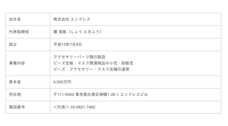 ビーズ・アクセサリーパーツを取り扱うショップ「PARTS CLUB(パーツクラブ)」を全約90店舗運営する株式会社エンドレス(本社:東京都台東区、代表:代表取締役 蕭(しょう)易風(えきふう))は、マスク専門ブランド「MASK CLUB(マスククラブ)」を立ち上げ、2020年7月7日(火)に「MASK CLUB」オンラインストアをオープンしました。