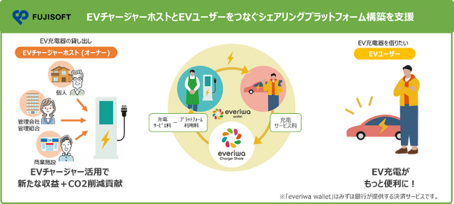 富士ソフト株式会社は、アマゾン ウェブ サービス(AWS)およびUXデザインの豊富な知識で、パナソニック株式会社 エレクトリックワークス社様の新サービス「everiwa Charger Share(エブリワ チャージャー シェア)」の事業化を支援しました。電気自動車(EV)普及の壁となっている充電インフラへの不安を解消し、カーボンニュートラルの実現に貢献します。