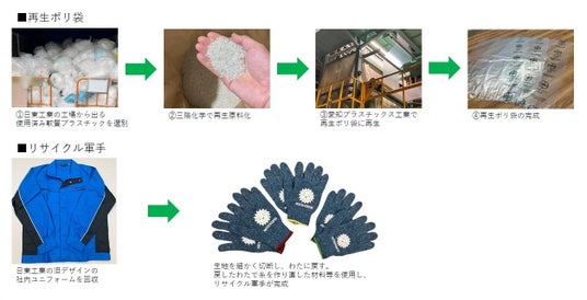 この取り組みでは、日東工業の工場から出る使用済み軟質プラスチックを、工場内で素材に応じて選別し、原料として利用可能なものを仕分けします。仕分け後の軟質プラスチックは、同じくPTメンバーである三陽化学株式会社(愛知県蒲郡市、以下 三陽化学)で再生原料化した後、愛知プラスチックス工業株式会社(愛知県蒲郡市、以下 愛知プラスチックス工業)にて成形して、再生ポリ袋に生まれ変わります。製造した再生ポリ袋は、日東工業の社内で使用するとともに、今後、より地域を巻き込み、こうした循環の取り組みを広げて行くための方策等について、PTで検討を進めていきます。