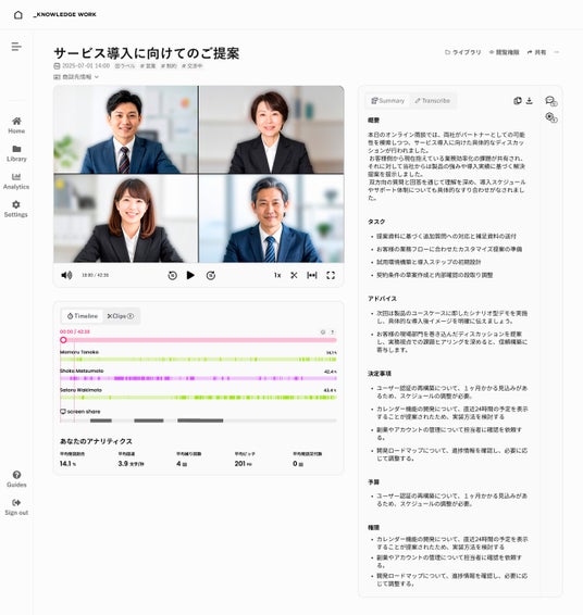 「ナレッジワークAI商談記録」は、オンライン(Web会議・IP電話)・オフライン(対面訪問)の商談を録音録画し、AIによって文字起こしや議事録作成・CRM/SFA入力を自動化するクラウドサービスです。ナレッジワークが2025年5月1日に全株式を取得したPoetics社が展開してきた商談解析AI「JamRoll」の技術を用い、当プロダクトを提供します。