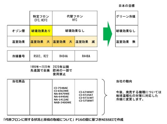 - 現在世界的にオゾン層への影響がなく温暖化作用が少ない冷媒への置き換えが検討されています。