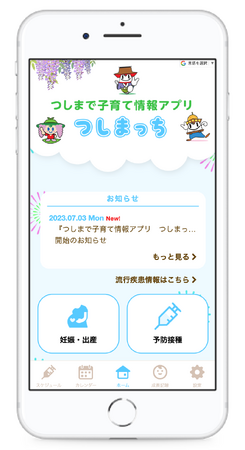 子育て中の保護者と津島市の子育て支援情報を「マッチング」するアプリという想いを込めて「つしまで子育て情報アプリ つしまっち」と命名しました。トップページには、津島市公式キャラクター「つし丸」「ふじか」「マッキー」が登場。津島市らしさが詰まった、こだわりのデザインでお届けします。