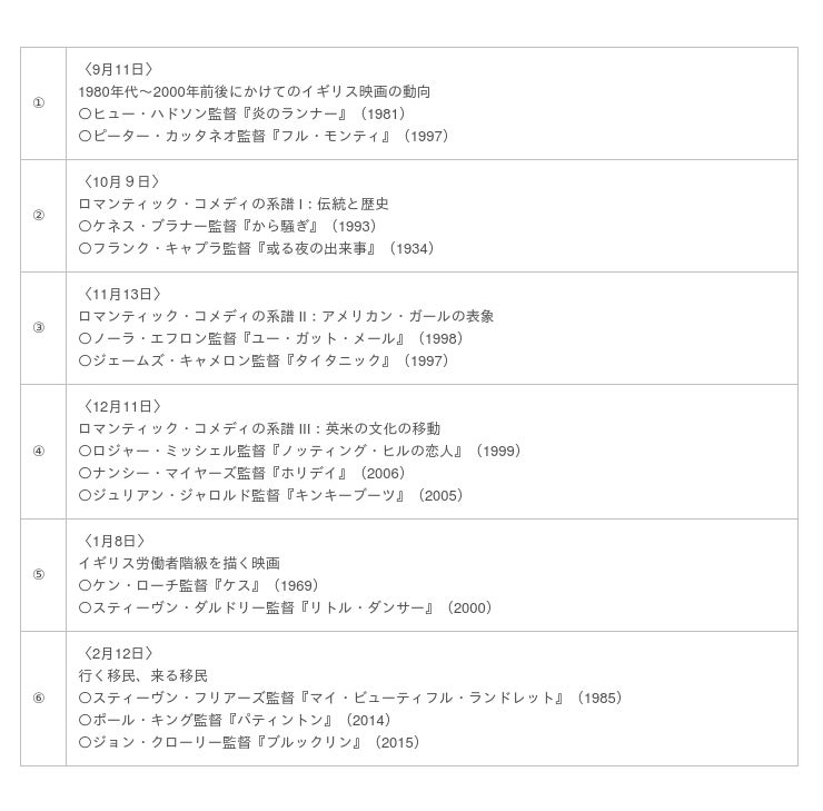 講座内で扱われるのは、ピーター・カッタネオ監督『フル・モンティ』(1997)、スティーヴン・ダルドリー監督『リトル・ダンサー』(2000)等のイギリス映画の数々にくわえて、英米の関係をあらわすハリウッド映画であるジェームズ・キャメロン監督『タイタニック』(1997)、ロジャー・ミッシェル監督『ノッティング・ヒルの恋人』(1999)、ナンシー・マイヤーズ監督『ホリデイ』(2000)など。これらの映像作品を、イギリスの政治、文化、歴史、階級、ジェンダー、移民などの多角的視点から読みとき、イギリス文化、創造産業、国際関係の〈現在〉について考えてみるこの講座に参加してみませんか。
