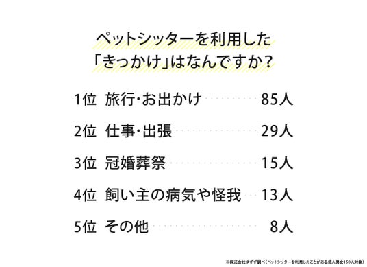 ペットシッターを利用したきっかけを尋ねたところ、1位は「旅行・お出かけ」85人でした。続いて「仕事・出張」29人、「冠婚葬祭」15人、「飼い主の病気や怪我」13人となりました。