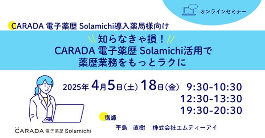 クラウド電子薬歴『CARADA 電子薬歴 Solamichi』の企画・開発・販売を行う株式会社ソラミチシステムは、同サービスの利用者を対象にした無料オンラインセミナー「知らなきゃ損!CARADA 電子薬歴 Solamichi活用で薬歴業務をもっとラクに」を2025年4月5日(土)、18日(金) に開催します。