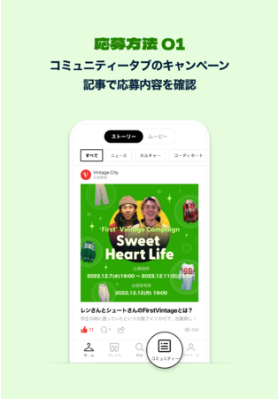 STEP1.ヴィンテージ・ファッション・アプリ「Vintage.City(ヴィンテージ・シティ)」内の「コミュニティ」ページに公開される「キャンペーン記事」で応募内容を確認。