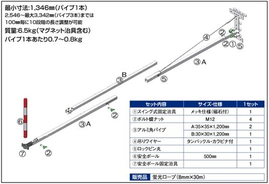 1)マグネット固定式・アルミ伸縮ポールで短時間に楽々設置