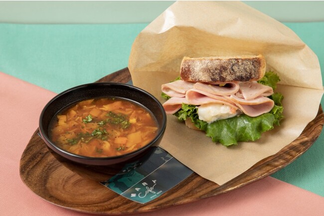 野菜とベーコンのあったかコンソメスープとハムレタスサンドのセットです。
