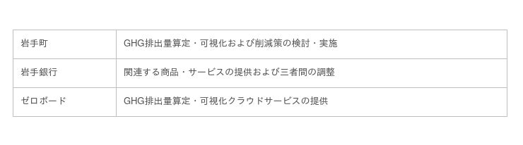 GHG(温室効果ガス)排出量算定・開示・削減を支援するソリューション「zeroboard」を提供する株式会社ゼロボード(東京都港区、代表取締役:渡慶次 道隆、以下「当社」)は、岩手銀行(代表取締役頭取:岩山 徹)と岩手県岩手町(読み:いわてまち、町長:佐々木 光司)との三者による、地域脱炭素の実現に向けた協定の締結いたしました。地域の脱炭素化実現に向け、当社と地方公共団体が協働する取り組みは岩手県内で10例目となります。