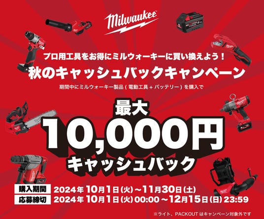 ミルウォーキーツール・ジャパン合同会社(本社:東京都板橋区、ゼネラルマネージャー:林琢磨)は、10月1日(火)~11月30日(土)の期間中、電動工具とバッテリーを同時にご購入いただくと、最大10,000円をキャッシュバック(※)する「秋のキャッシュバックキャンペーン」を実施いたします。