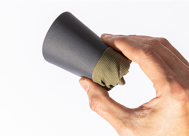 わずか27g(Mサイズ)。ウルトラライト志向のキャップです。本体には、あえてハリコシの少ない生地を用いているので、小さく折り畳むことができます。さらに、形状記憶のツバ部もクルクルっと丸めることができる優れもの。使わないときは、ポケットやバックパックの雨蓋にすっぽり収まります。