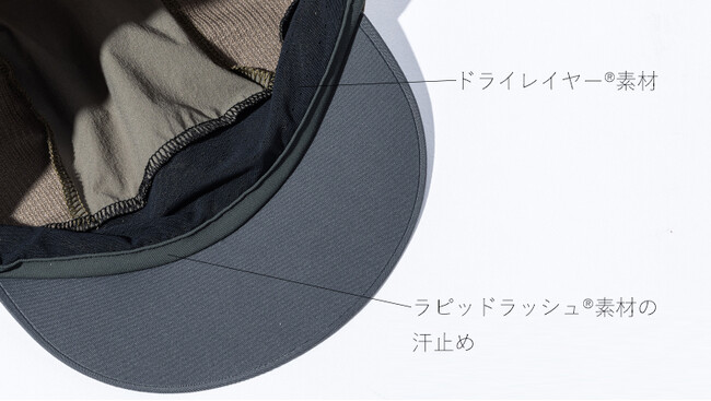 ウエアと同じ「ドライレイヤリング」のメカニズムを搭載。汗のベタつきや濡れを抑えるため、頭囲をぐるっと一周「ドライレイヤー」素材で当て布し、その表側にベースレイヤー素材「ドラウトタフ」を配置。肌をドライに保ち、スピーディに吸汗拡散します。