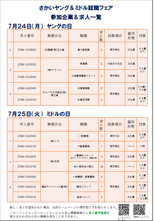 ハローワーク堺のホームページで求人情報を公開しています。開催日前日までに最寄りのハローワークの職業相談窓口で事前申し込みのうえ、紹介状の交付を受けてください。応募状況によっては先着順で応募を締め切ります。(申し込みに関する問い合わせ先:ハローワーク堺 職業相談第1部門 072-238-8301 部門コード41#)