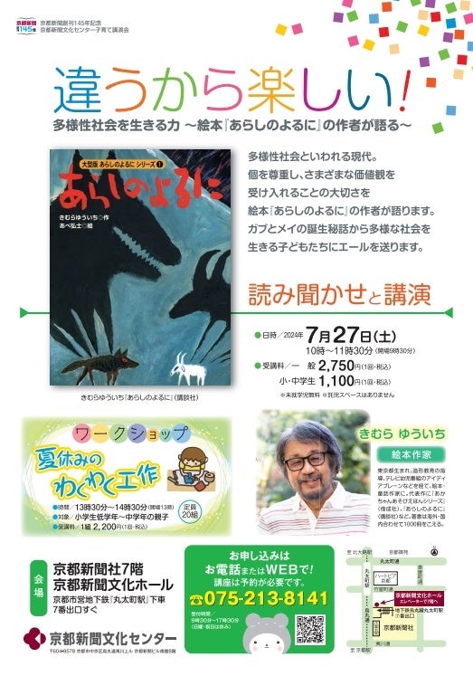 京都新聞グループの京都新聞文化センターでは、京都新聞創刊145年を記念して子育て世帯を応援するため、絵本作家による読み聞かせと講演会を開催します。