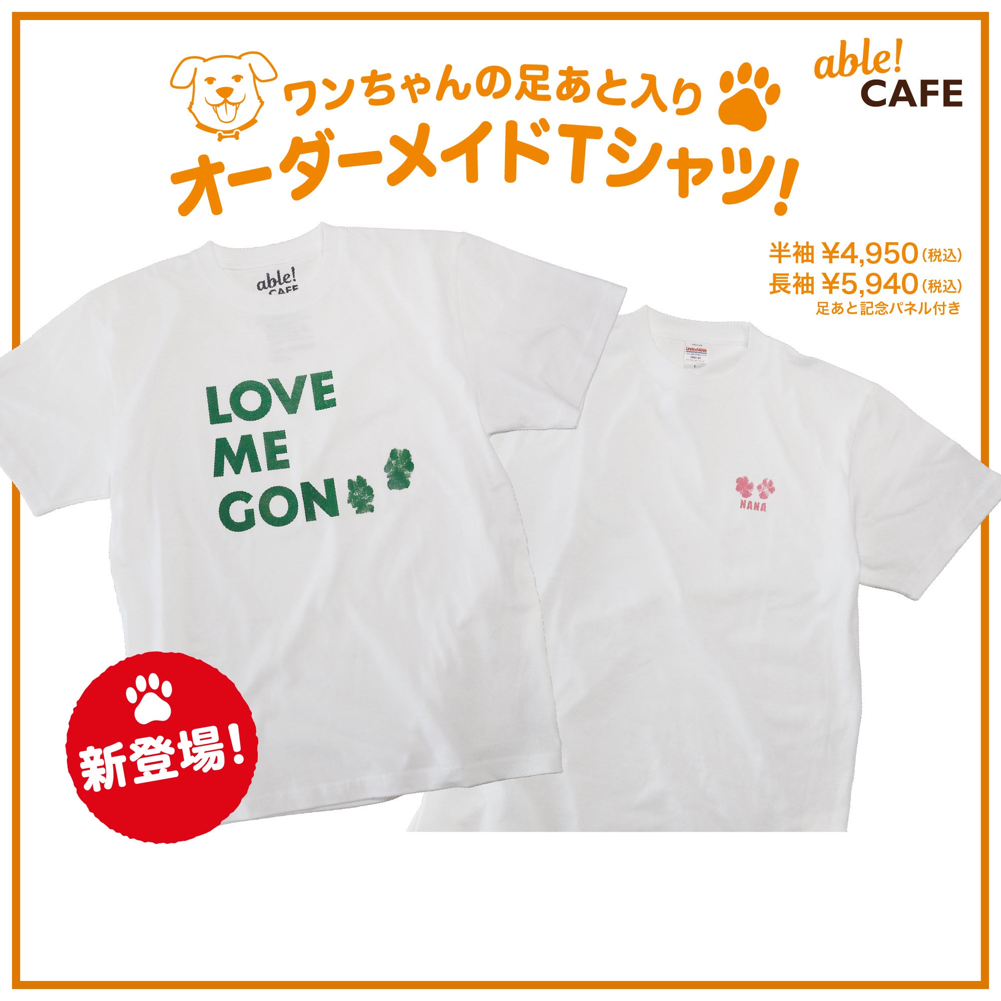 愛犬と一緒に併設の「able! CAFE」へご来店いただき、その場で取った足あとをデザインに落とし込み、世界に一つだけのオリジナルTシャツを制作するサービスです。