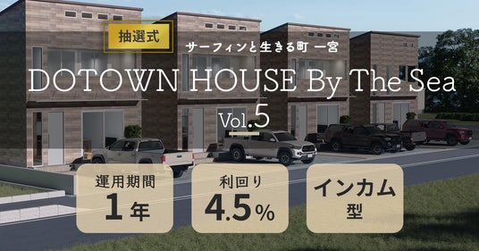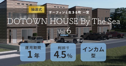 DOTOWN×利回りくん地域活性化ファンドシリーズは、周辺地域のエリア開発と活性化を促進する人気の投資ファンドです。これまでに組成された4つの「DOTOWN HOUSE By The Sea」では、全てが募集額を上回る応募がありました。前回の好評を受けて、今回も同一の一宮エリアで新築物件を対象にファンドを立ち上げます。