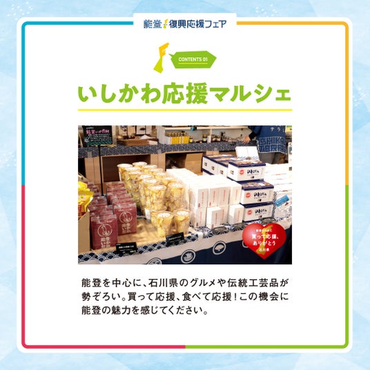 能登を中心とした石川県産のお菓子やお酒、工芸品など、魅力的な商品を販売の他、石川県と包括連携協定を締結している大手通信キャリア3社(KDDI株式会社、株式会社NTTドコモ、ソフトバンク株式会社)のご協力のもと、能登半島地震や奥能登豪雨の復旧・復興段階や今後の活用が見込まれる各社の最新技術の展示も予定しております。