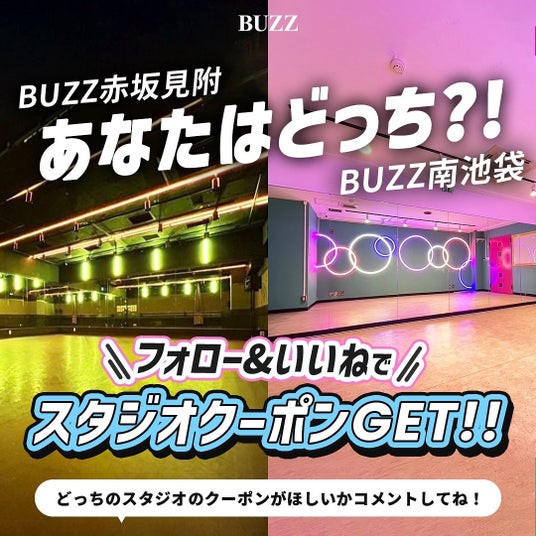 公式Instagramのフォロー&いいねでBUZZ赤坂見附 or BUZZ南池袋のスタジオクーポンをプレゼント!