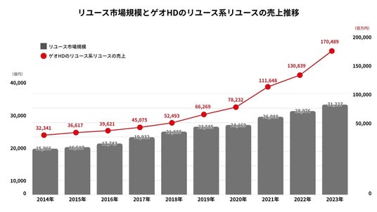 「リユース市場データブック2024」(リユース経済新聞社刊)によると、国内リユース市場規模は拡大を続け、2025年には3兆2,500億円の市場規模になると予測されています。拡大するリユース市場の中で、ゲオホールディングスのリユース系リユースの売上(※)は、市場の成長率を上回る成長を続けています。