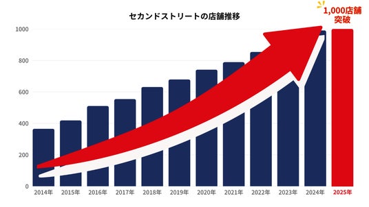 衣料・服飾品から家具、家電、生活雑貨まで、さまざまなリユース品を取りそろえる総合リユースショップ「セカンドストリート」は、1996年に1号店となるセカンドストリート東バイパス店をオープンしました。その後、2016年3月に500店舗、2018年9月に600店舗、2022年7月に800店舗を達成し、2025年4月25日(金)には国内外で1,000店舗を突破する予定です。