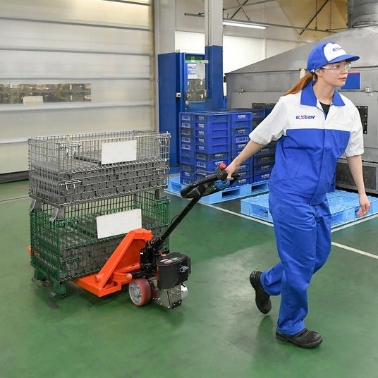 重量物を載せたパレットも、電動アシストの力で楽に搬送可能です。エクセディ製の電動アシストユニットを搭載した、株式会社をくだ屋技研様から発売中の製品を展示します。
