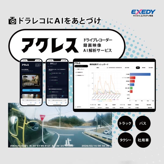 既存のドライブレコーダー映像をAIが解析し、危険運転やファインプレーを自動検知するサービスです。(ティーティス社製/子会社の株式会社エクセディ物流が販売)