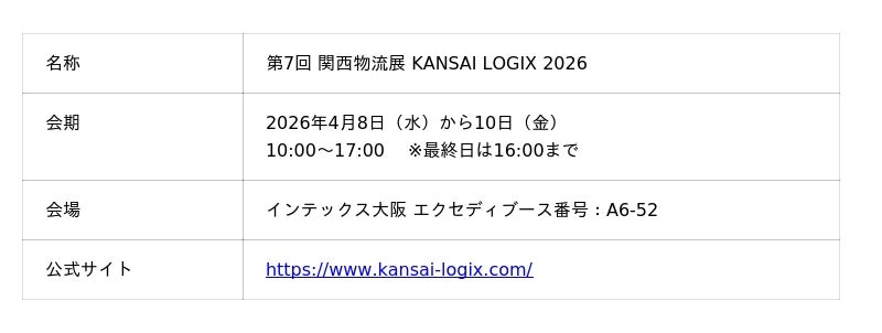 株式会社エクセディ(本社:大阪府寝屋川市、代表取締役社長:吉永 徹也)(以下、エクセディ)は、2026年4月8日(水)から10日(金)までインテックス大阪で開催される「第7回 関西物流展 KANSAI LOGIX 2026」に出展いたします。本展示会では過去最大規模のブースを設け、物流現場の喫緊の課題である「人手不足」と「重労働」を解決するための最新ソリューションをご提案します。AMR「Neibo(ネイボ)」の自動搬送デモンストレーションや、電動アシストタガー「EMOVA(エモーヴァ)」の操作体験会など、「見て・触れて・実感できる」多彩なコンテンツをご用意しております。