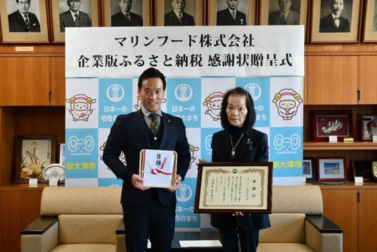 この度、泉大津市(市長:南出賢一)は、マリンフード株式会社(本社:大阪府豊中市 代表取締役社長:吉村直樹)から企業版ふるさと納税制度を活用したご寄付をいただいたことに伴い11月25日に感謝状贈呈式を執り行いました。