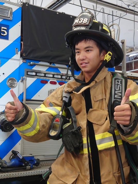 私が特に印象に残ったことは、消防署で実際に消防士の方が着ている服を着させてもらったことです。とても重たく、動きにくさも感じましたが、消防署の人たちはこれを着て、市民を守っていると知り、とても尊敬する気持ちになりました。市内見学を通して、カイザー市は落ち着いた雰囲気の中にも地域を大切にする温かさがあると感じました。特に、案内をしてくれた人たちの親切な対応から、人の優しさに触れることができました。この日の体験で学んだことをや感じた温かさを大切にして、これからの学校生活や地域での活動にも生かしていきたいと思います。(Y.Y)